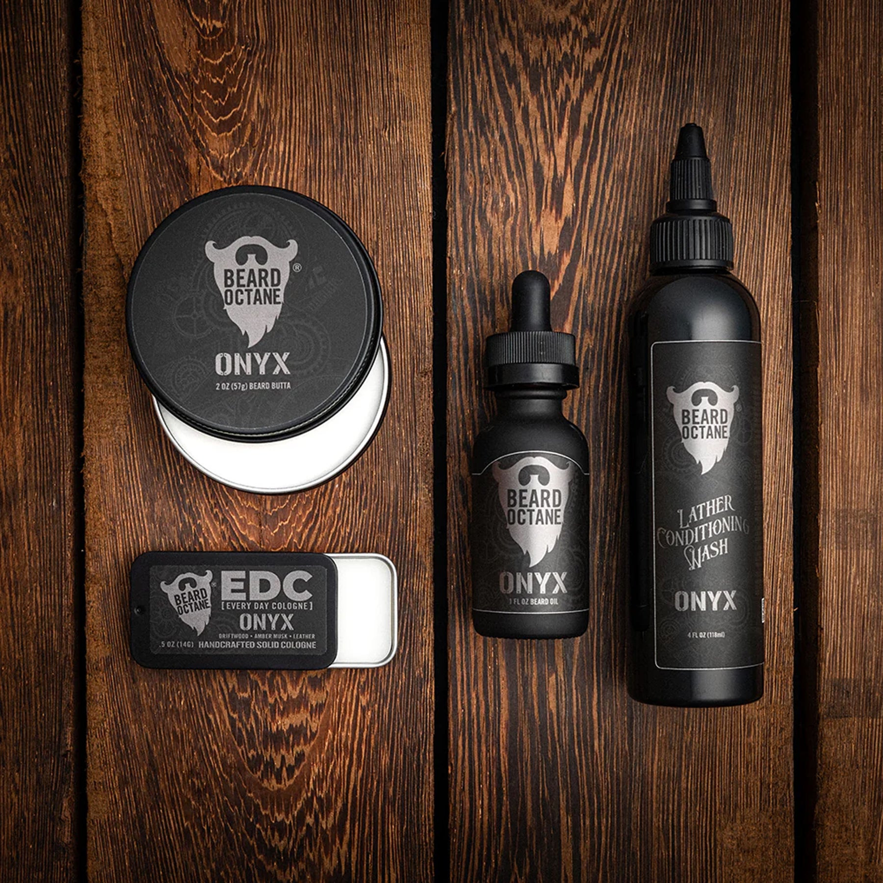 Inhalt der Box: ONYX Bartöl (28 ml), ONYX Lather Conditioning Wash (113 ml), ONYX Beard Butta (56 ml) und ONYX Solid Cologne (14 ml).