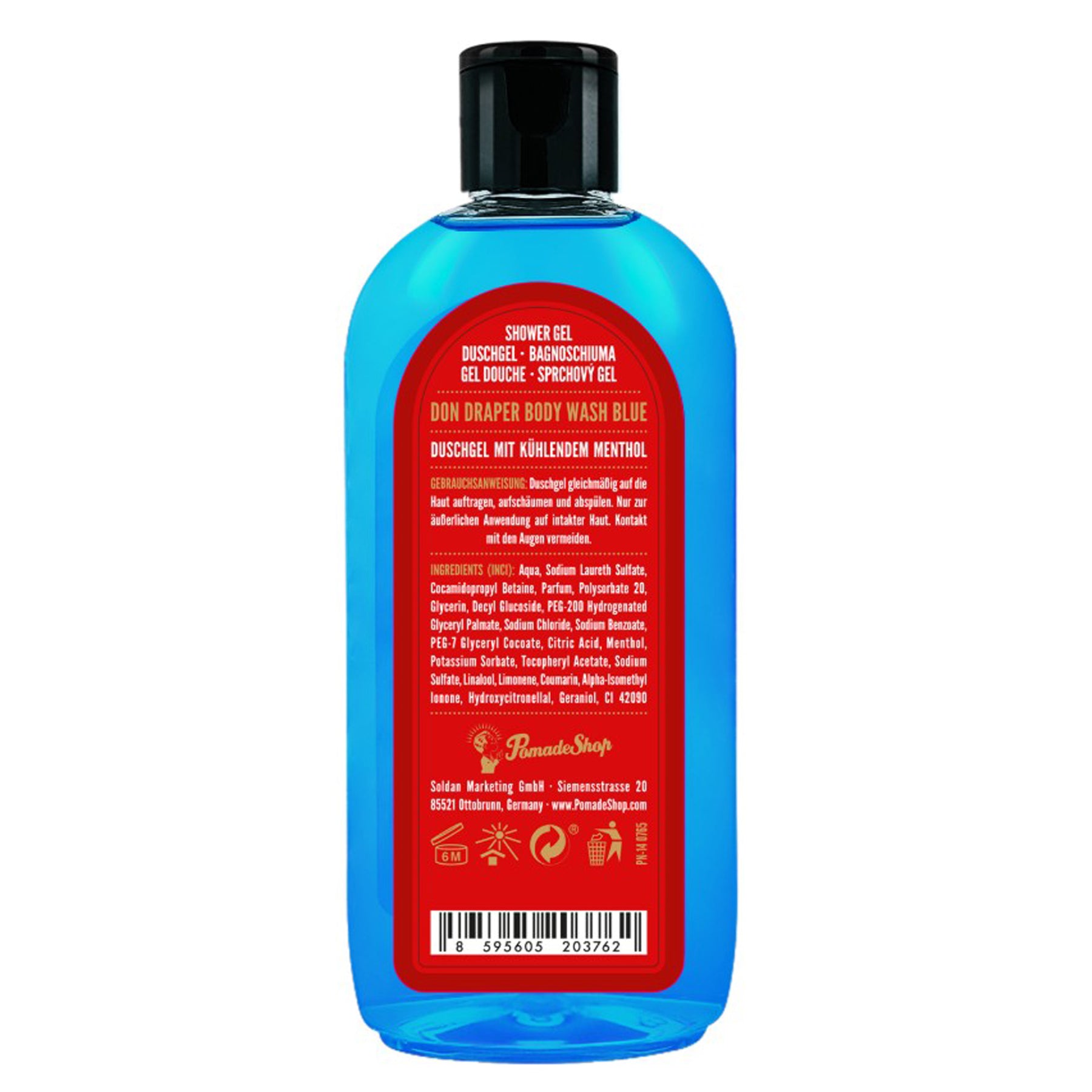 Das Don Draper Body Wash Blue ist ein mildes Duschgel und Shampoo mit kühlendem Menthol. Es fühlt sich unglaublich gut und seidig an und reinigt ab de ersten Anwendung effektiv und sanft. Angereichert ist es mit Glycerin und Vitamin E. Ohne Tierversuche, Konservierungsstoffe, Parabene, Silikone, Mikroplastik oder Palmöl. Mit dem beliebten Don Draper Blue Duft, bekannt vom gleichnamigen After Shave und Hair Tonic.